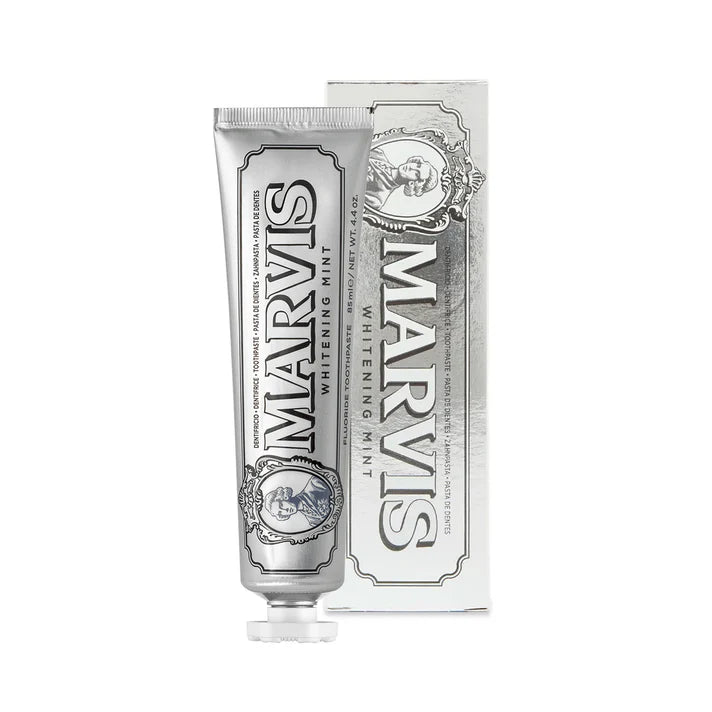 An unquestionably stylish and quality choice for your oral health and bathroom shelf, Marvis toothpastes combine a mint base with original aromatic flavours to give a long lasting pleasurable taste sensation. Daily use helps prevent tooth decay, fight tartar and plaque and keep breath fresh. Rich, dense and creamy in texture, Whitening Mint contains a cocktail of ingredients that gently but effectively work to reduce discolouration of the teeth. The resulting flavour is a sharp taste of cool mint. Made in Italy.